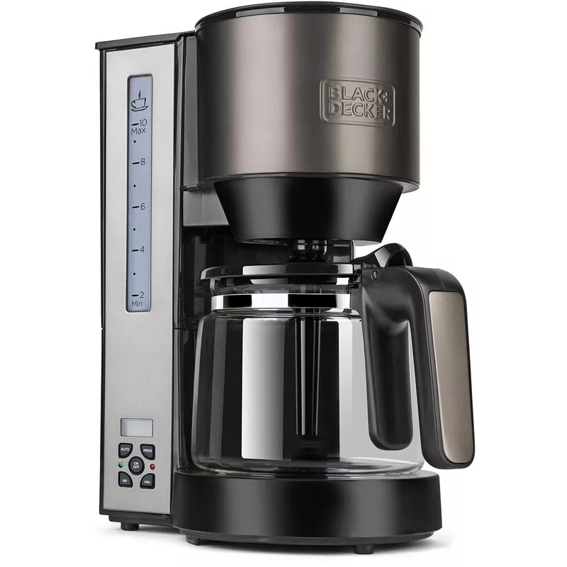 Empieza los días con energía y deja que la nueva cafetera de BLACK+DECKER te prepare el mejor café de forma automática. Programa la hora exacta en su intuitiva pantalla LCD y despreocúpate, tu café estará listo y esperándote justo cuando lo prefieras. Gracias a su filtro permanente, podrás utilizar la cafetera las veces que quieras sin necesidad de adquirir recambios. La elegancia de sus acabados de acero inoxidable, te permitirán mantener la cafetera siempre a la vista en cualquier rincón de tu cocina, pero si prefieres guardarla podrás hacerlo fácilmente gracias a sus reducidas dimensiones. Con gran capacidad, la nueva cafetera de goteo de Black and Decker está diseñada para preparar hasta 10 tazas de café de una sola vez. demás, gracias a su resistencia, el café permanecerá caliente durante 40 minutos y después se apagará automáticamente. También podrás calentarlo, una vez frío, sólo volviendo a poner en marcha la cafetera. Su jarra graduada, con una capacidad de hasta 1.25L,