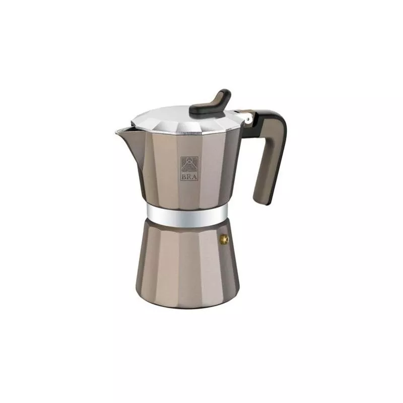 CAFETERA. BRA. TITANIUM. Aluminio 12 tazas, apta para todo tipo de cocinas, excepto para inducción.