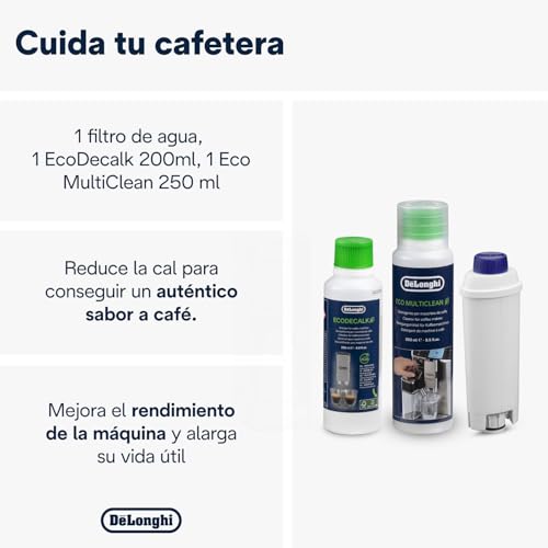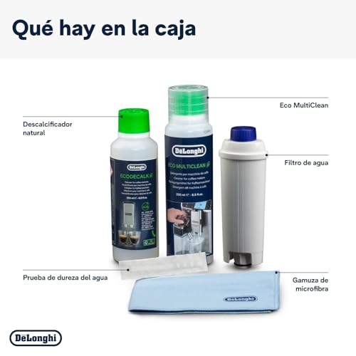 De'Longhi Kit de limpieza Coffe Care De'Longhi para cafeteras DescripciónIncluye filtro de agua, descalcificador ecodelcalk de 200ml, botella MultiClean de 250ml.