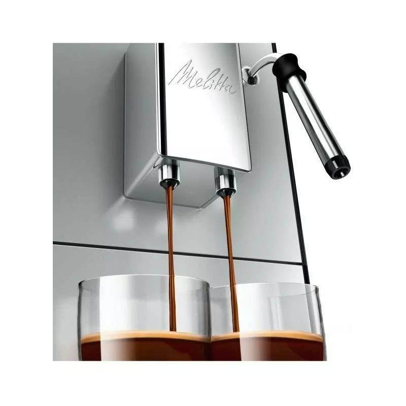 Melitta CAFFEO SOLO & milk. Diseño: Independiente, Color del producto: Plata, Tecnología de elaboración de café: Espresso machine. Café tipo de entrada: Granos de café, Tipos de bebida: Capuchino, Café expreso, Agua caliente, Capacidad de reservorio de agua: 1,2L. Carga conectada: 1400W. Ancho: 20 cm, Profundidad: 45,5 cm, Altura: 32,5 cm