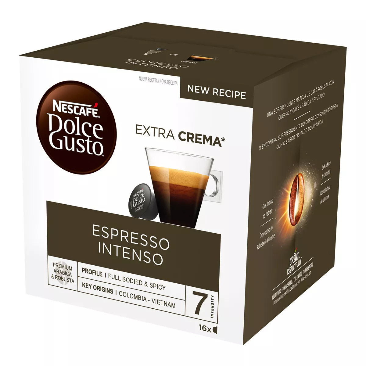 Nescafé Dolce Gusto Estuche 16 cápsulas NESCAFE DOLCE GUSTO café Espresso Intenso Premium arábica y robusta de Colombia y Vietnam intensidad 7 DescripciónCaja de 16 cápsulas Espresso Intenso Nescafé Dolce Gusto, café arábica y robusta. Con cuerpo, carácter, aroma y un sabor muy intenso.Sólo válida para las máquinas de café Dolce Gusto.