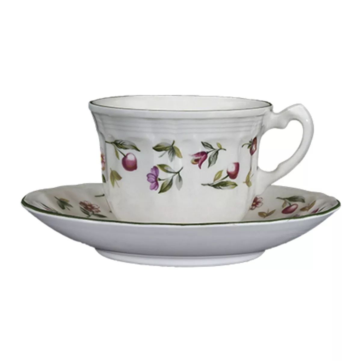 San Claudio Taza de té con plato Grana New San Claudio DescripciónCon un patrón de deliciosas flores y frutas con borde decorado, esta taza de té con plato a juego irradia encanto y estilo. Su toque romántico y vintage, lo convierte en una pieza que no pasa de moda.Realizada en loza, es resistente y apto para el lavavajillas y microondas.