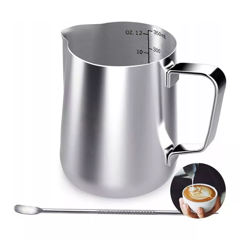 Capacidad y tamaño: El diseño simple y la boquilla antigoteo no se estropearán y la torta será perfecta; Habilidad: 350 ml de espuma de leche enlatada; También puedes guardar esta olla para usar otros líquidos o hervidores de leche o café. Botellas anchas: Este tipo de botella se puede utilizar para producir té y suministrar una mezcla de leche, nata, agua, zumo, pasta, dulces, etc. lattetearpen: un bolígrafo profesional; Los dedos de la pluma artificial son muy delicados, adecuados para grandes lotes avanzados que quieren crear líneas con el tiempo. Recipiente de acero inoxidable: La marca de medición está hecha de acero inoxidable n.° 304 de alta calidad, libre de BPA y BPA, resistente al calor y al óxido, duradera y segura. Lavado rápido y apto para lavavajillas: La superficie es lisa y fácil de limpiar después de su uso; Puede usarlo inmediatamente en agua jabonosa, que también es segura para el lavavajillas. Una cafetera portátil de 350ml, que puede ser con marcas de medida y